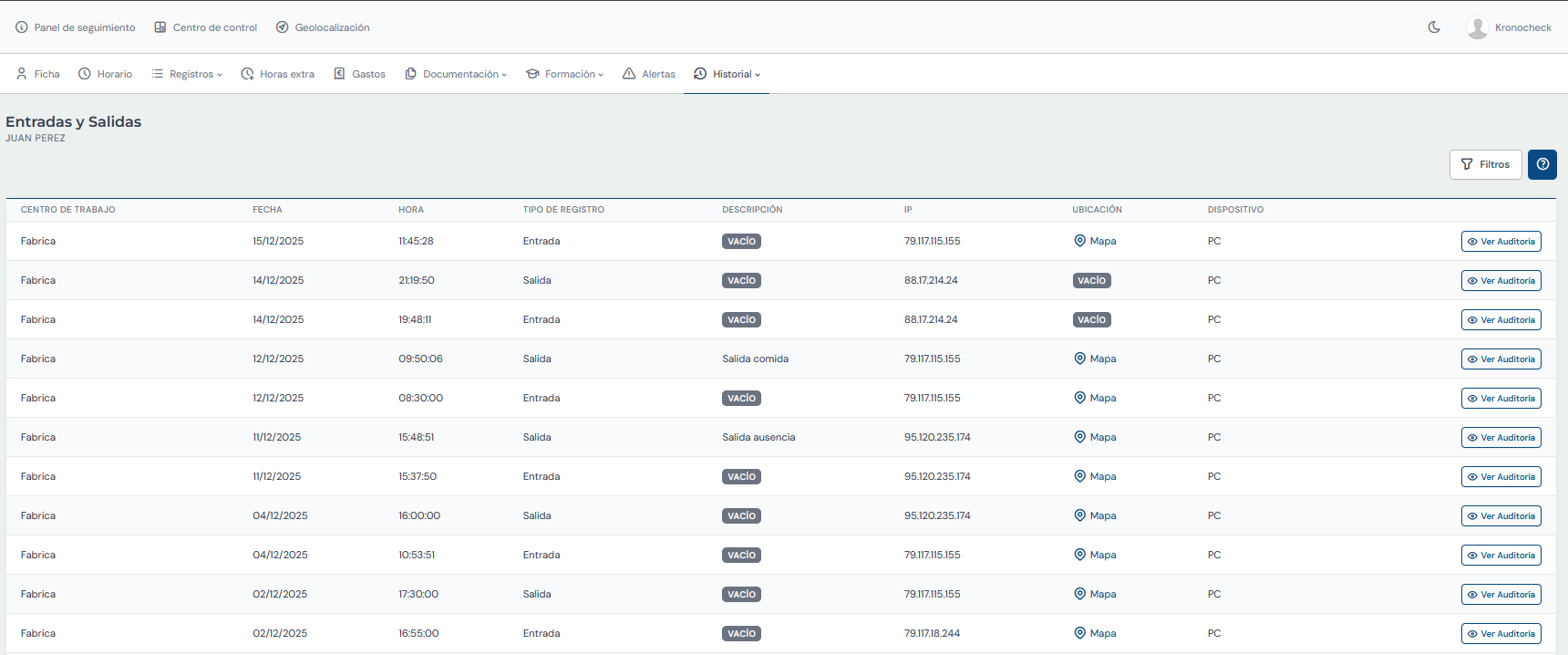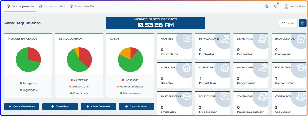 Kronocheck ofrece un registro de jornada digital completo y conforme al Real Decreto de 2025.