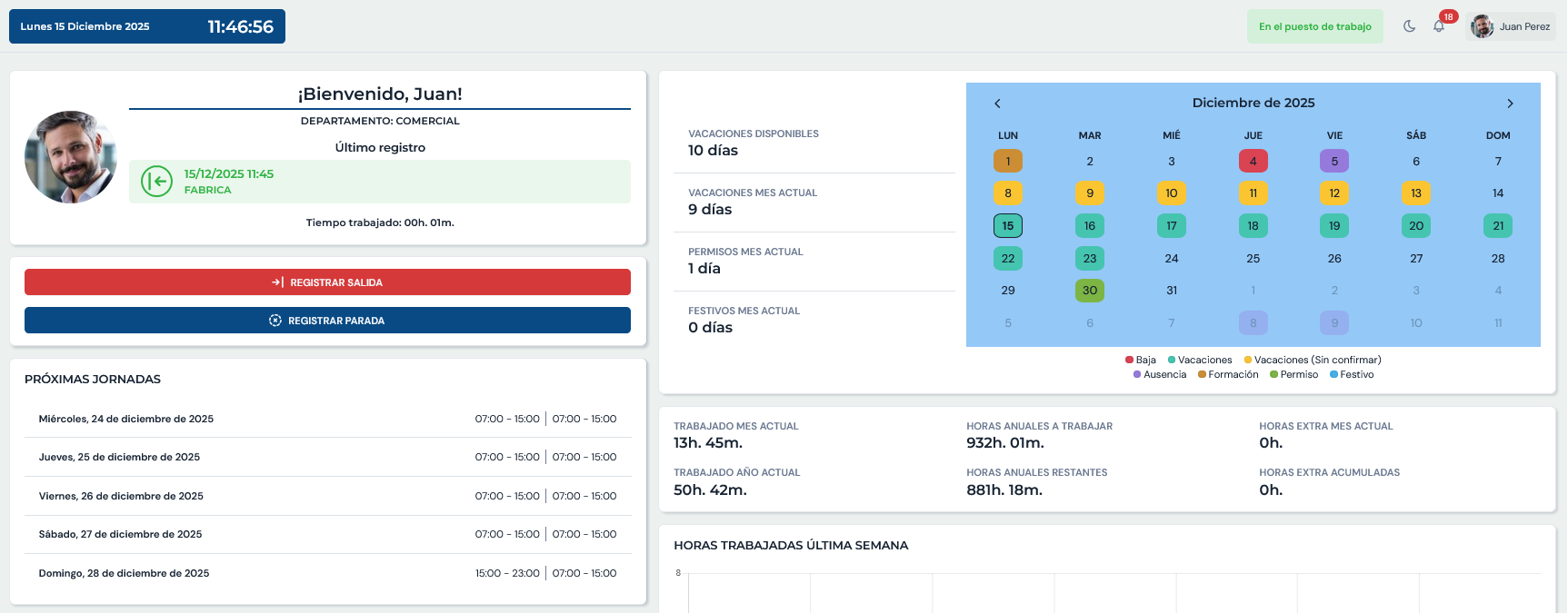 Supervisa en tiempo real fichajes, ausencias y vacaciones. Controla la asistencia y el estado del personal desde un solo lugar.