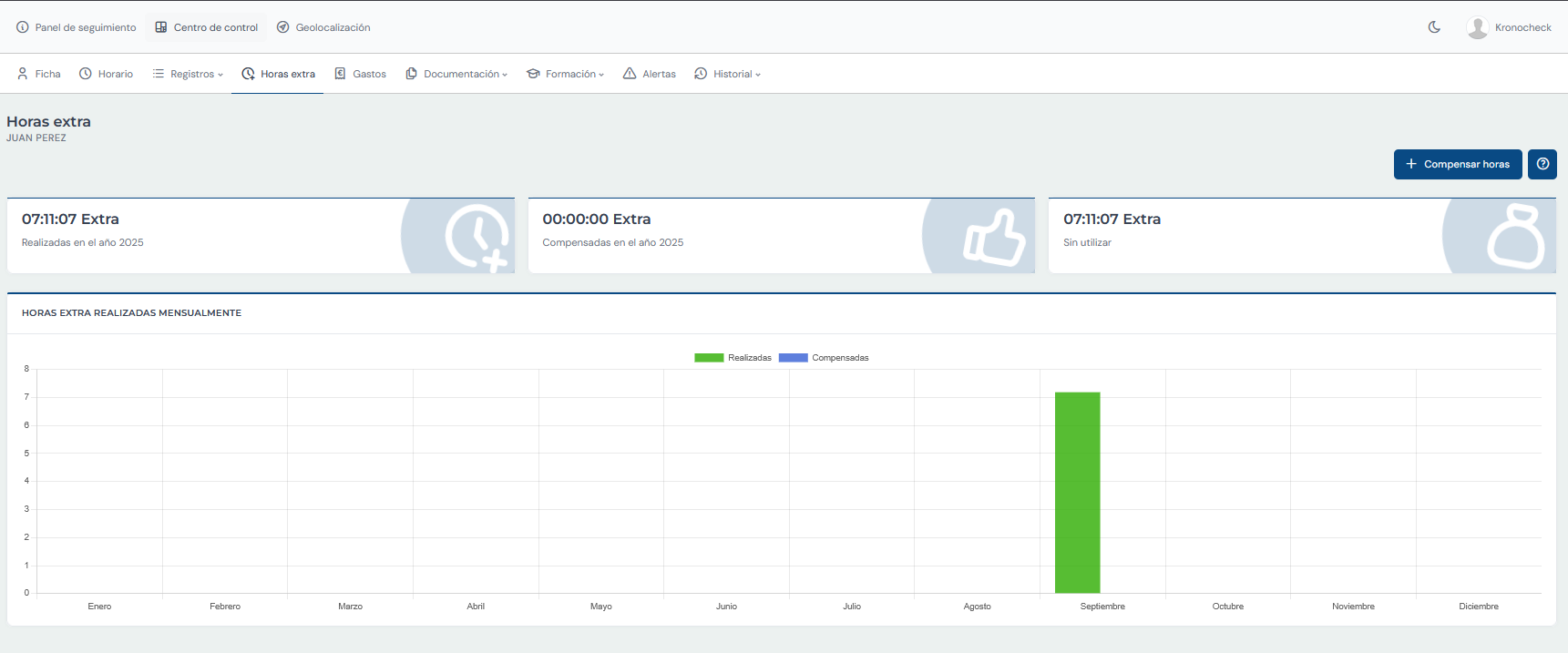 Kronocheck registra tanto las horas extra, como las horas complementarias. También permite gestionar y documentar su compensación.